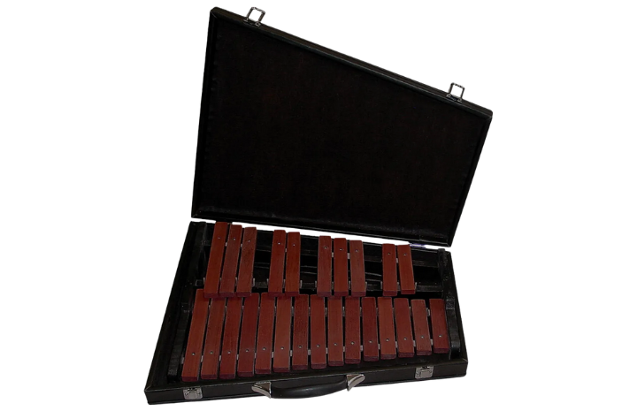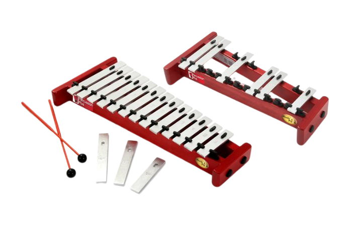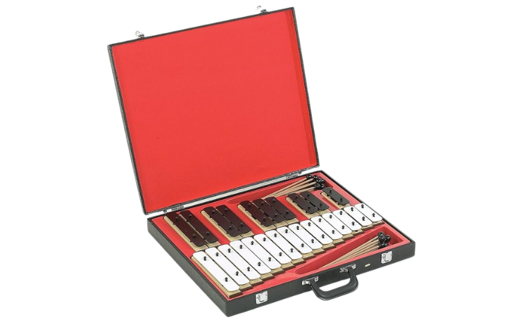 Kõlaplaatide komplekt (25 tk), 25 nuia ja kohver. Ulatus: 2 oktaavi g1-g3, kromaatiline.