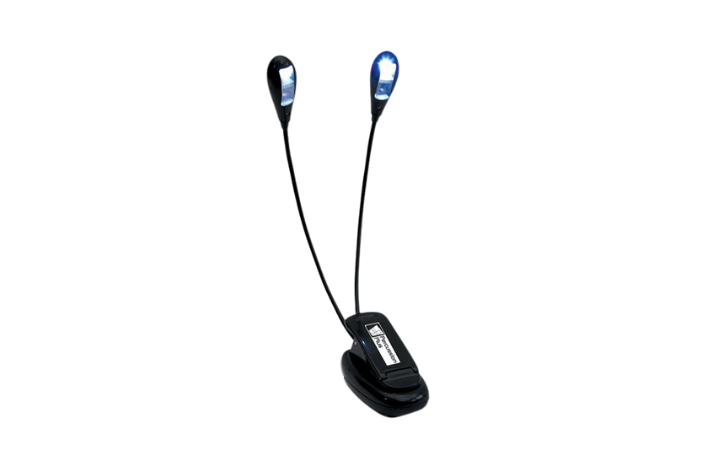Näpitskinnitusega ja kahe painduva jalaga lamp, töötab nii patareidega kui USB-toitega. Kaasas 3 AAA-patareid ja USB-juhe.