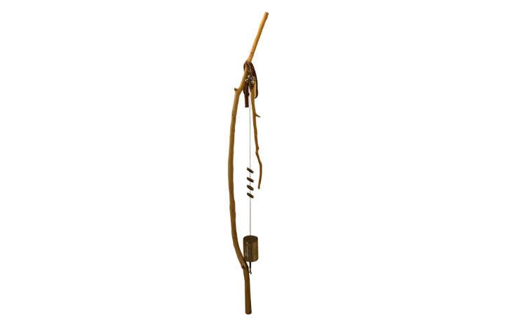 Puust jauramil küljes kuljused, metallkõlinad, plekkpurk.Kaasas puidust löömispulk ja riidest sinine kott.