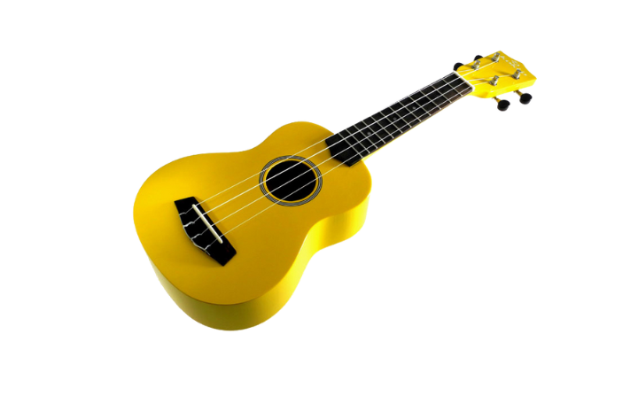Kollane nailonkeeltega sopranukulele. Kaasas must kott.